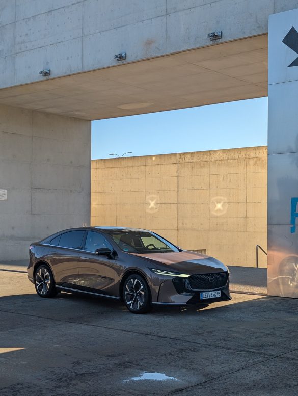 Het was mooi te zien hoe diezelfde principes terugkomen in de Mazda6e. Luciana legde uit dat Mazda’s designthema voor de 6e “Authentic Modern” is: eenvoudige, vloeiende lijnen die een moderne coupé-vorm vormen, maar met praktische functionaliteit. Net als in de archtitectuur van (o.a.) het Museum Memoria draait het om proportie, licht en de relatie tussen binnen- en buitenruimte. Mazda probeert in deze auto die mensgerichte filosofie letterlijk vorm te geven.